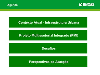 O documento discute a infraestrutura urbana no Brasil e o Projeto Multissetorial Integrado (PMI) do BNDES. O PMI financia projetos de urbanização em áreas carentes, beneficiando mais de 11 milhões de pessoas. Uma avaliação mostrou que o PMI tem cumprido seu objetivo de fornecer infraestrutura básica, mas enfrenta desafios como falta de projetos e atrasos nas obras. O BNDES planeja novas estratégias para melhorar a execução dos projetos.
