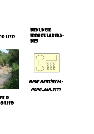 O documento discute os problemas do Córrego Liso, incluindo esgotos clandestinos, depósito de lixo e entulho, e assoreamento. Ele fornece soluções como denunciar irregularidades, não jogar lixo ou desmatar a área, e preservar o córrego.