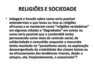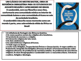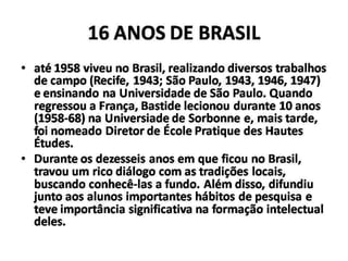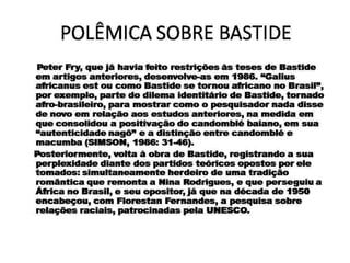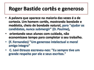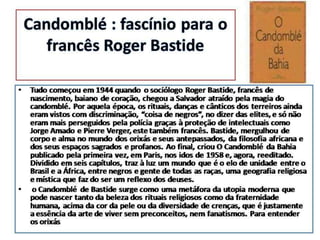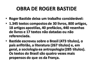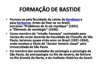 Roger Bastide nasceu na França em 1898 e estudou em faculdades locais até se juntar ao serviço militar durante a Primeira Guerra Mundial. Após a guerra, ele obteve um mestrado na Universidade de Bordeaux. Em 1938, Bastide foi contratado como professor de sociologia na recém-criada Universidade de São Paulo, onde estudou as religiões afro-brasileiras como o candomblé da Bahia.