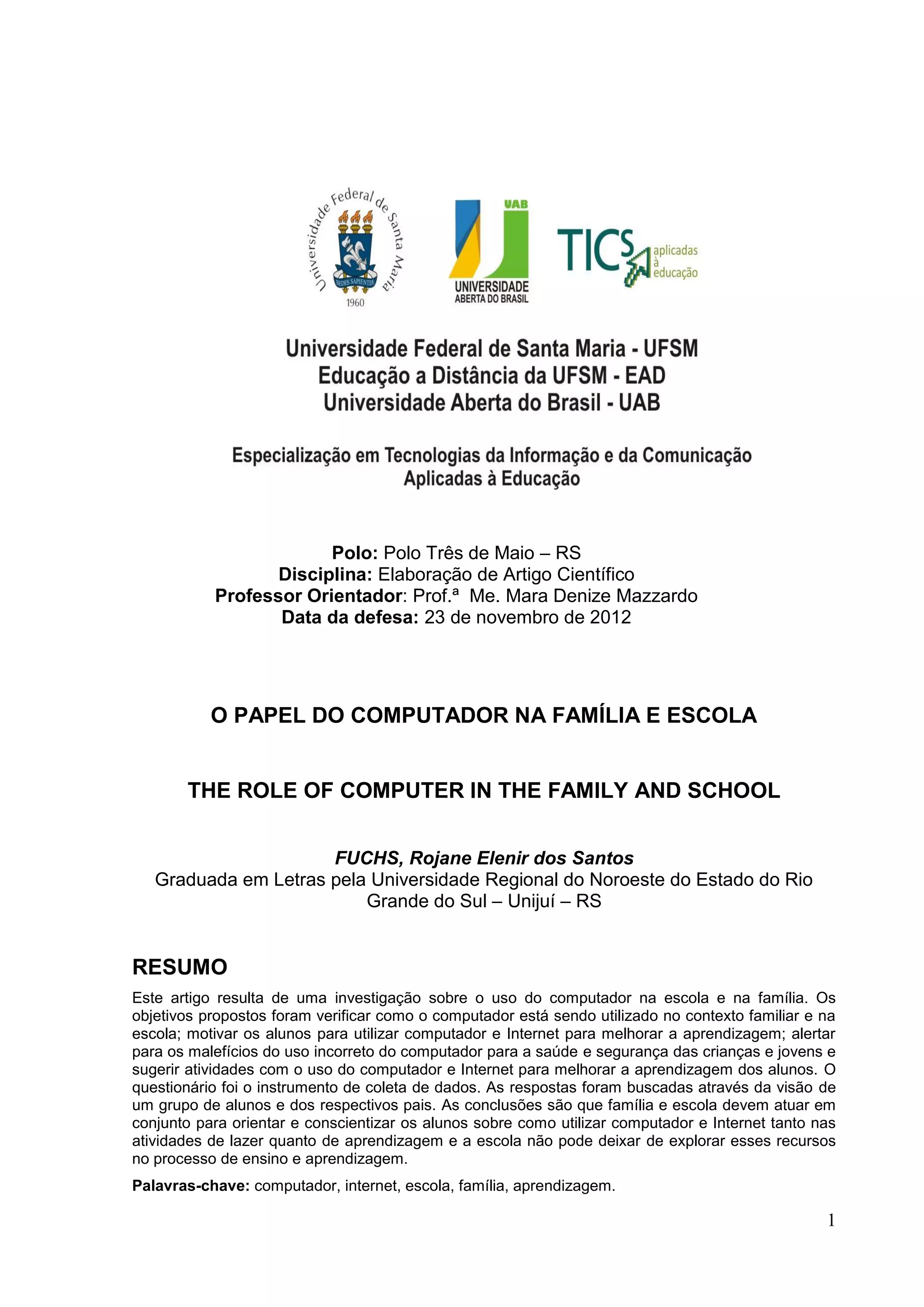 1. O documento discute o papel do computador na família e na escola, com foco no uso do computador e internet para melhorar a aprendizagem.