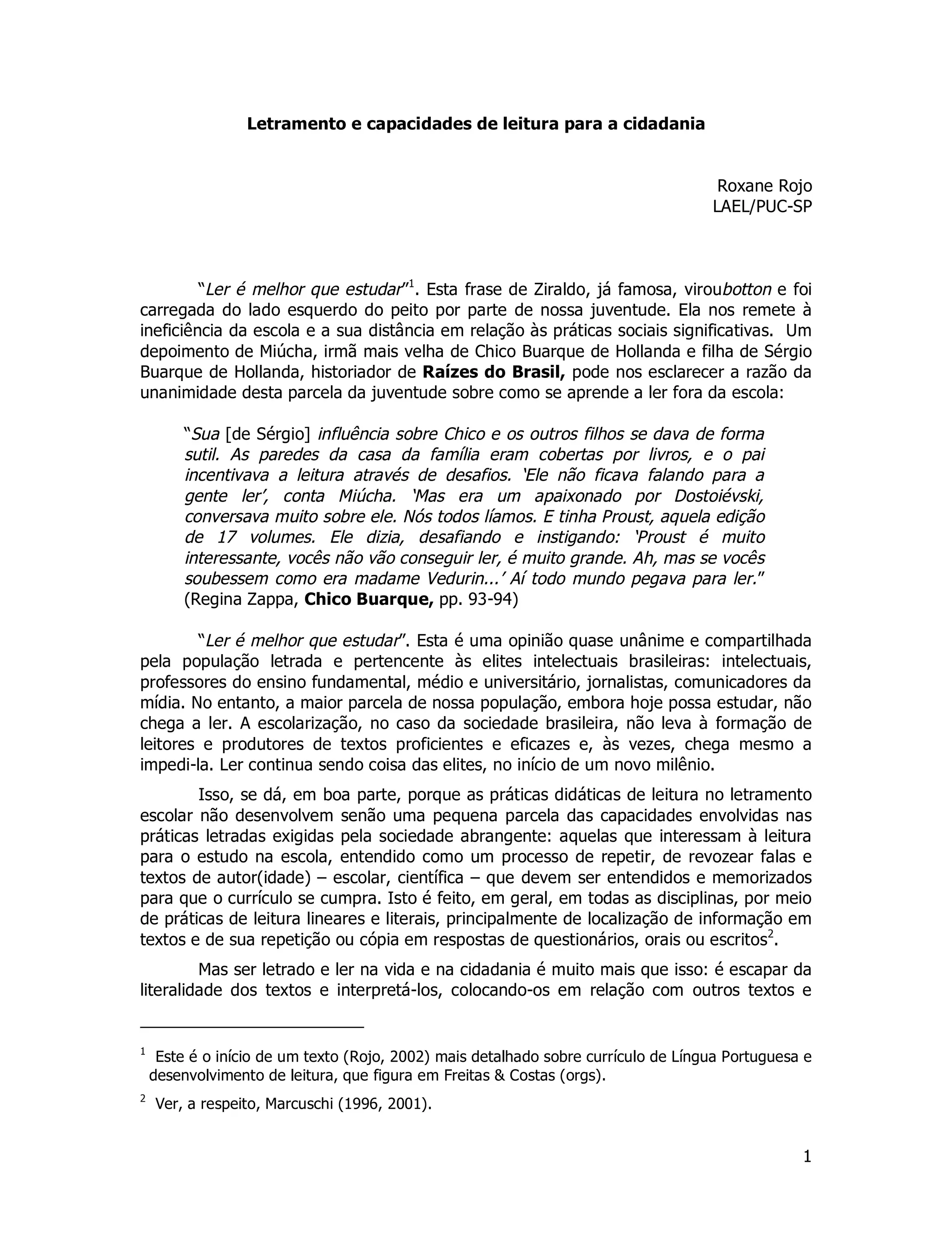 1) O texto discute as capacidades necessárias para a leitura cidadã, além da decodificação e compreensão literal ensinadas na escola.