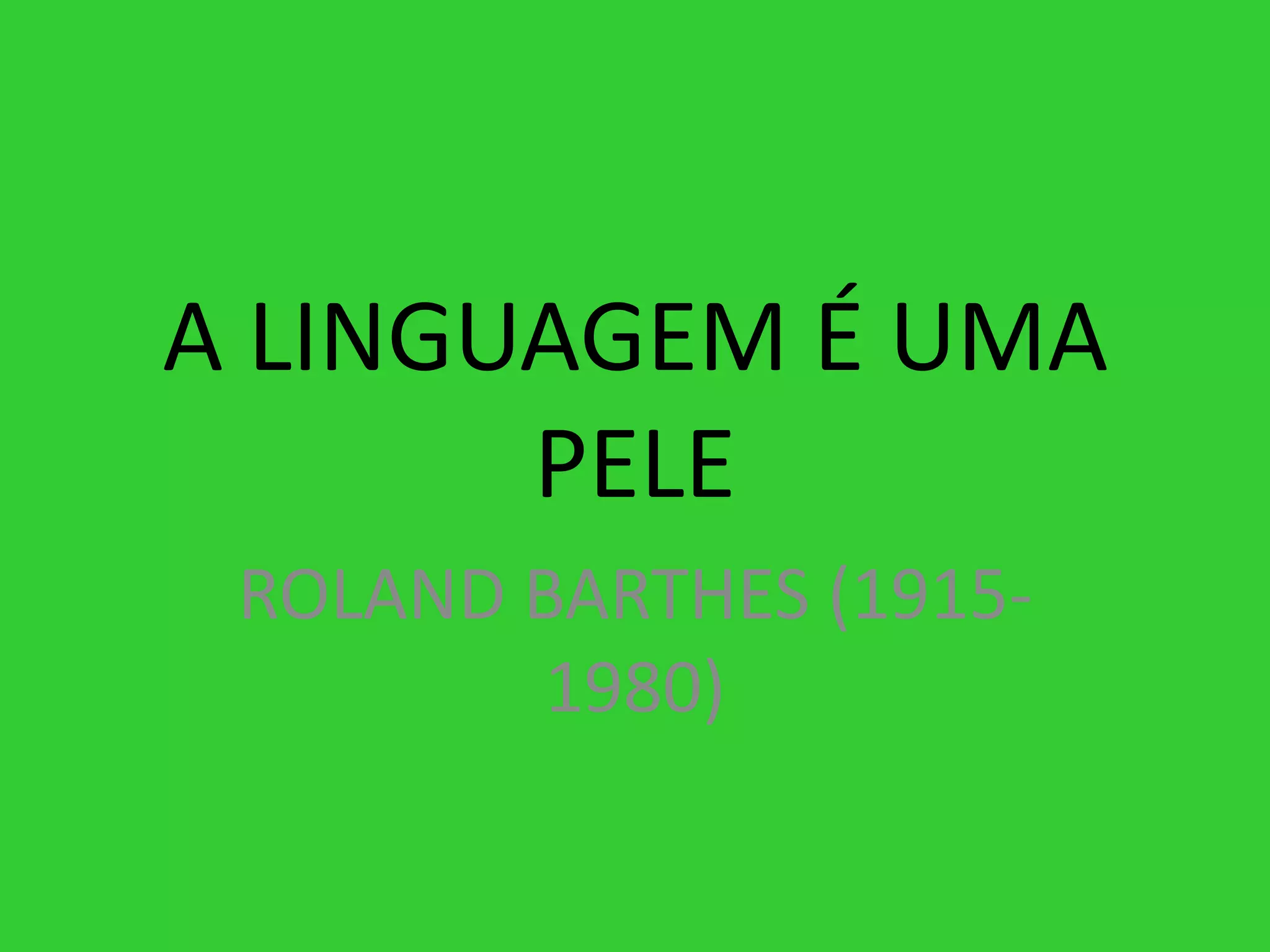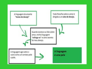 O documento discute a filosofia do amor de Roland Barthes e como ele via a linguagem de um amante como uma "pele" que treme de desejo oculto para o amado. Barthes acreditava que a linguagem de um amante não descreve o mundo de forma neutra, mas sim "treme de desejo" e é capaz de comover fisicamente o objeto de seu afeto. O documento fornece contexto biográfico sobre Barthes e lista algumas de suas obras-chave.
