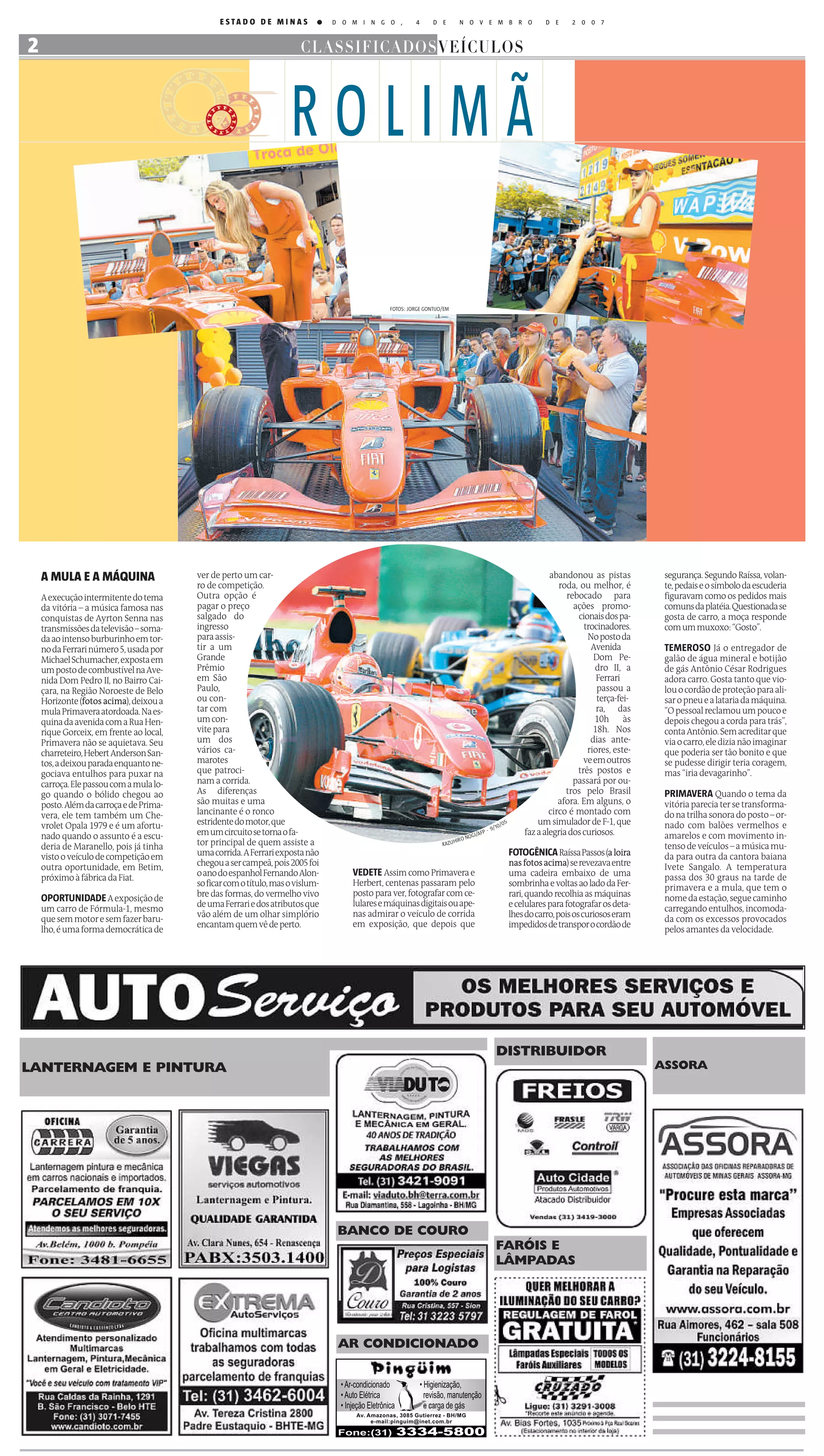 O documento descreve a exposição de um carro de Fórmula 1 da Ferrari em um posto de gasolina em Belo Horizonte. A mula Primavera ficou intrigada com o barulho do carro, enquanto seu dono negociava entulhos. Muitas pessoas pararam para ver e fotografar o carro, incluindo um entregador que quebrou as cordas de segurança para chegar mais perto. A exposição ofereceu uma oportunidade incomum para que pessoas comuns vissem de perto um carro de corrida.
