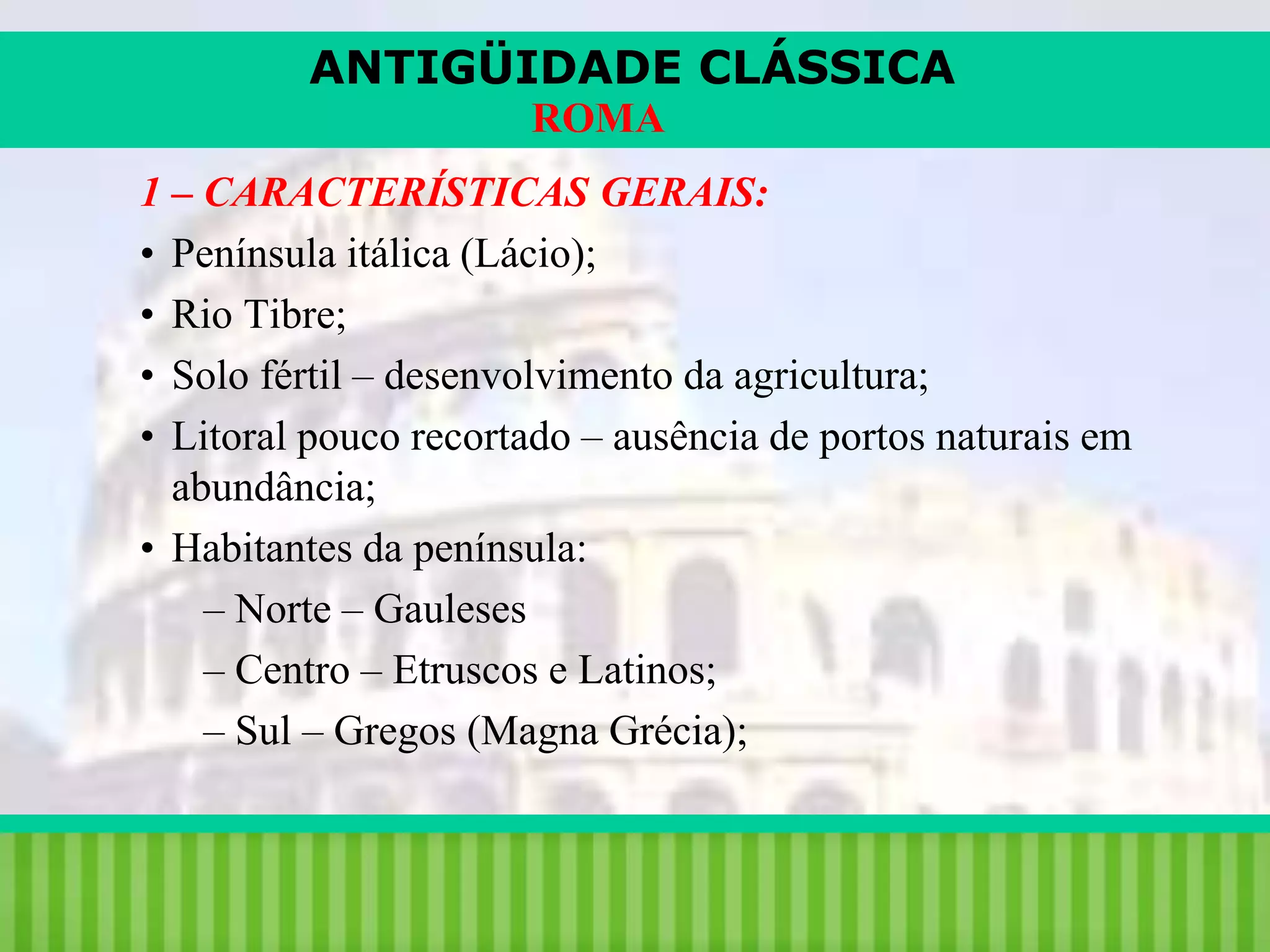 Roma foi fundada no século VIII a.C. na península itálica e passou por três fases principais: a Monarquia, a República e o Império. Sob a República, Roma expandiu seu território através de conquistas militares e estabeleceu-se como potência no Mediterrâneo. No Império, Roma atingiu seu auge político e territorial, porém entrou em declínio devido a crises econômicas e invasões bárbaras.