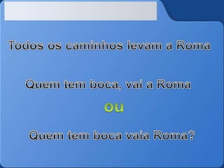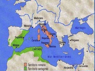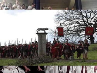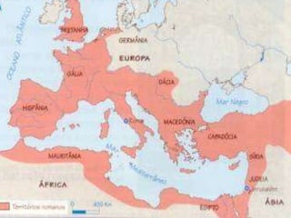 O documento descreve a história de Roma, desde suas origens míticas com Rômulo e Remo até a queda do Império Romano do Ocidente em 476 d.C. Inclui detalhes sobre a Monarquia, República e Império, como as conquistas territoriais, as lutas de classes entre patrícios e plebeus, e as tentativas de reforma no período republicano. Também aborda a transição para o Principado sob Augusto e as crises que levaram ao fim do Império no Ocidente