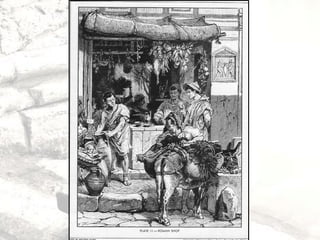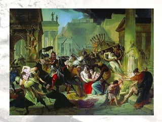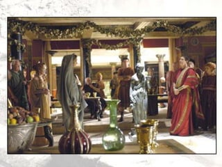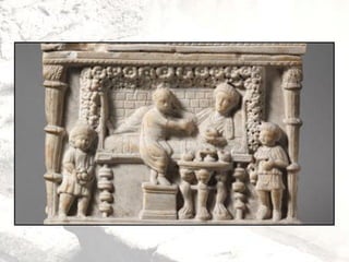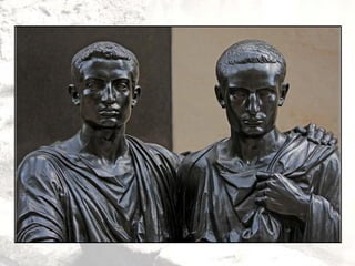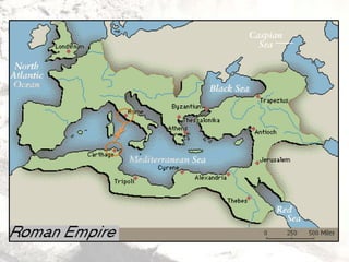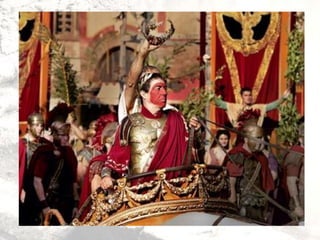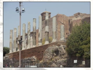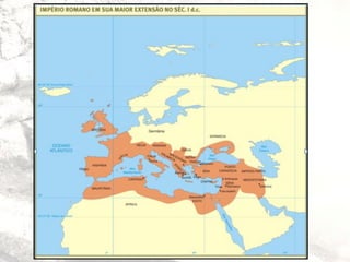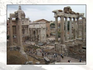 Este documento descreve a origem e evolução da sociedade romana desde suas origens até o período republicano. Resume como Roma foi fundada por tribos itálicas e se transformou em uma monarquia, depois república, com uma sociedade dividida entre patrícios, plebeus e escravos. Detalha as revoltas plebeias que ampliaram os direitos desta classe ao longo do tempo.