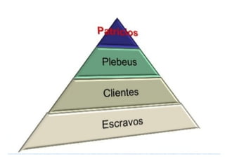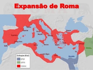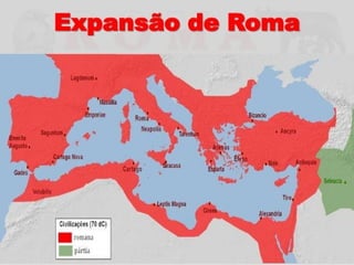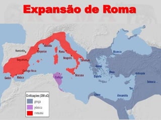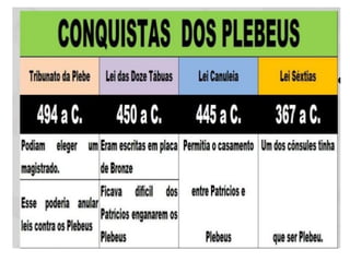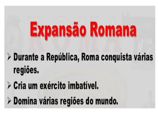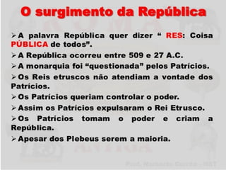 Durante a Monarquia, Roma era governada por reis, mas o poder real era limitado pelo Senado. Na República, o poder foi concentrado nos patrícios do Senado, excluindo os plebeus. Os plebeus conquistaram direitos ameaçando não lutar nos exércitos. Sob a República, Roma expandiu seu território através da conquista da Itália, Cartago e da Grécia, tornando-se uma potência dominante no Mediterrâneo.