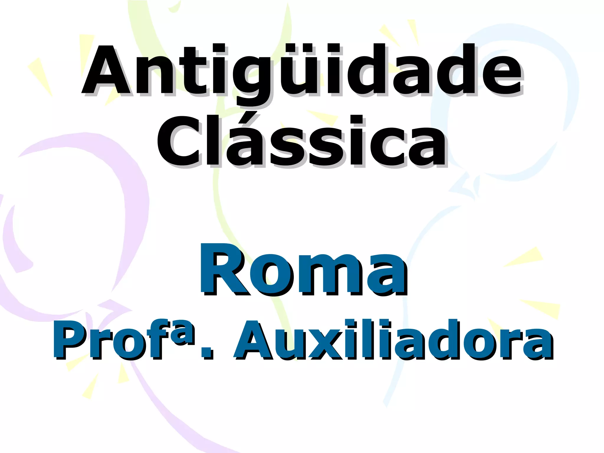 O documento resume a história da civilização romana desde suas origens até a queda do Império Romano do Ocidente. Aborda os primeiros habitantes da península itálica, a fundação lendária e histórica de Roma, a periodização entre Monarquia, República e Império, as conquistas territoriais, as crises políticas e as consequências culturais e religiosas do expansionismo romano.
