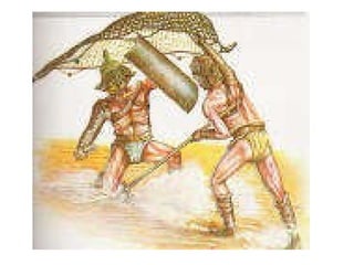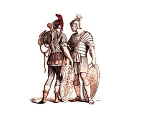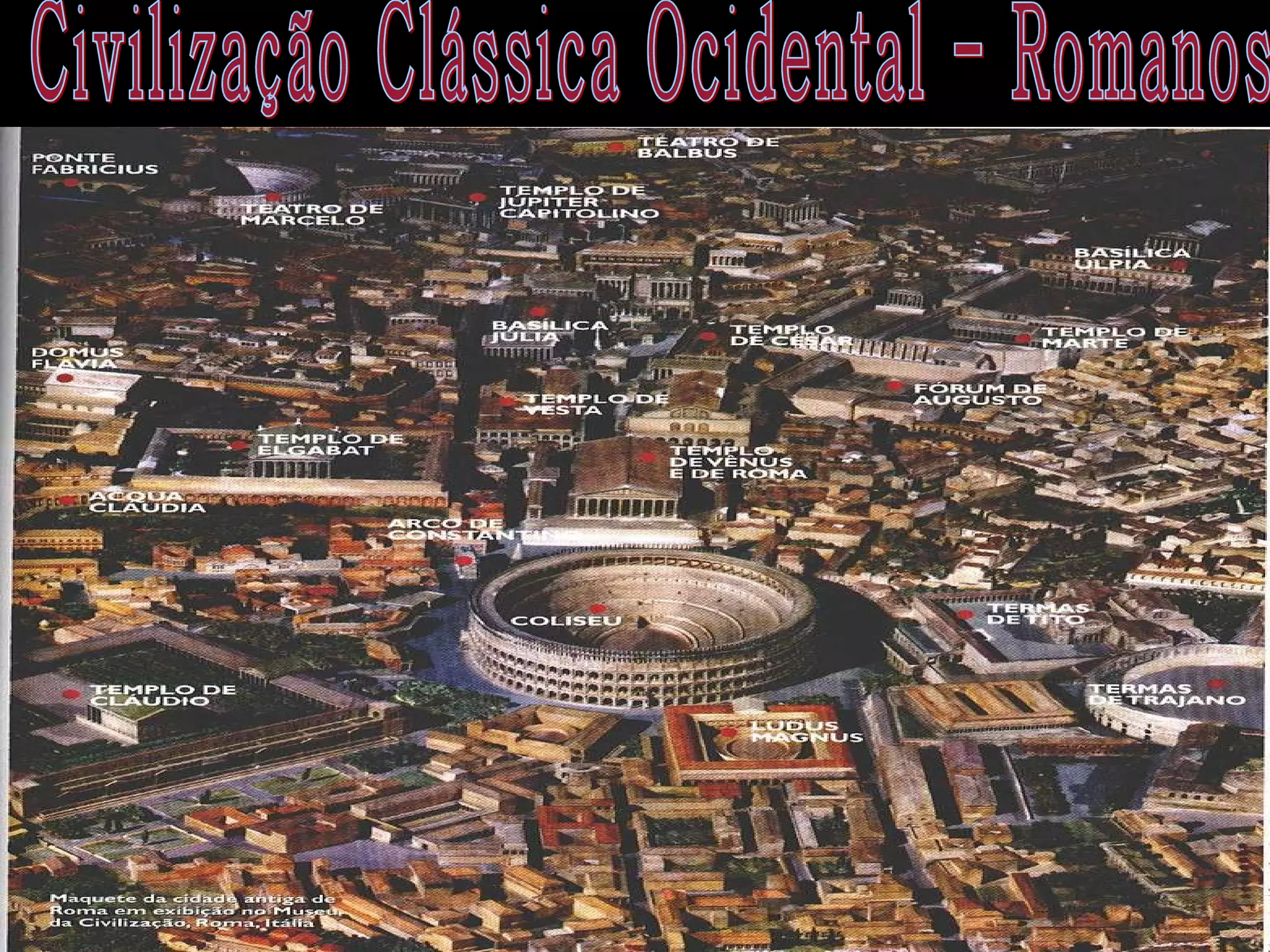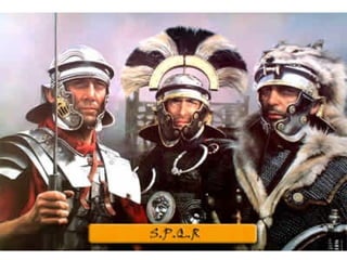 O documento descreve a civilização romana, começando com as origens míticas de Roma e a fundação da cidade por Rômulo e Remo. Detalha a evolução política de Roma, da monarquia à república até o império, assim como as leis plebéias e os triunviratos. Aborda também a expansão territorial romana, a crise do império e as reformas de Diocleciano e Constantino.