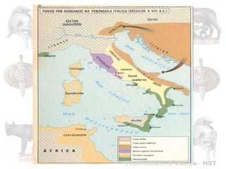 O documento fornece um resumo da história da Roma Antiga, desde sua fundação lendária por Rômulo e Remo até seu apogeu como um vasto império. Começou como uma pequena aldeia e cresceu para dominar grande parte da Europa e do Mediterrâneo, deixando uma rica herança cultural. Sua expansão ocorreu principalmente durante a República através de guerras como as Púnicas.