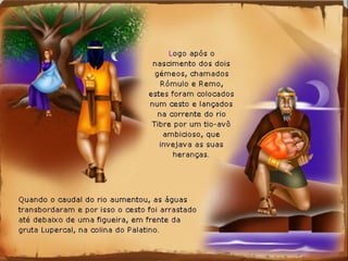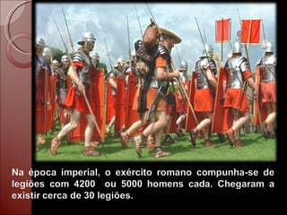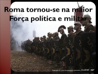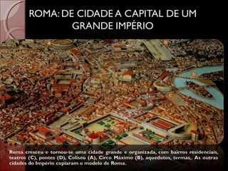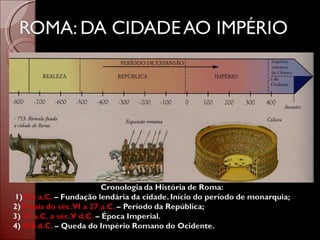Roma localizava-se na região do Lácio, perto do rio Tibre, na Itália Central. Os romanos conquistaram um grande império ao longo do Mediterrâneo através da guerra e administração centralizada. A economia romana era urbana, comercial e baseada na agricultura e escravidão.