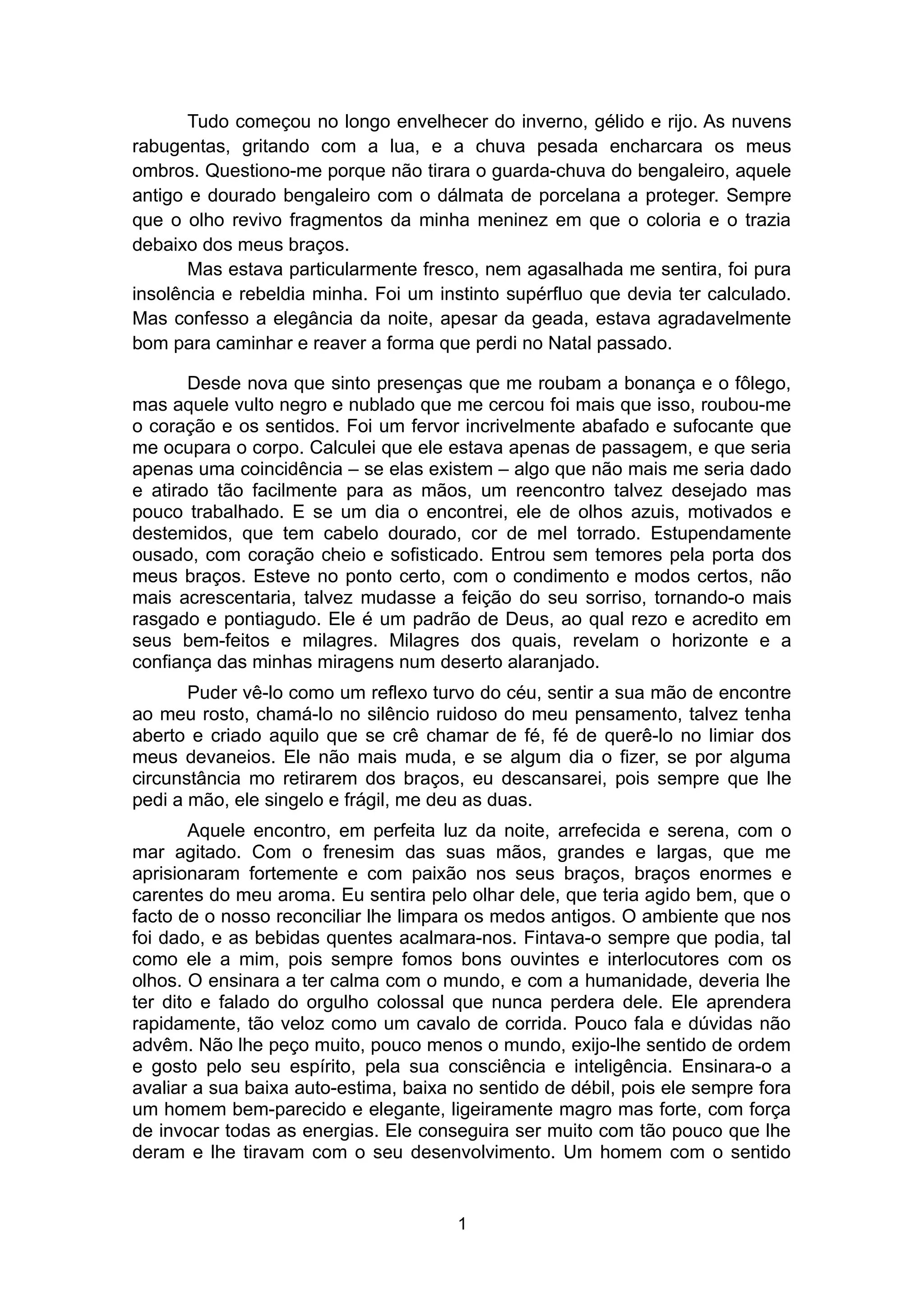 O documento descreve a relação apaixonada entre duas pessoas. A narradora sente uma forte atração e conexão com o homem, que a faz voar e a transporta para outro mundo quando estão juntos. No entanto, também sente dependência e medo quando ele se vai embora, deixando-a sozinha. Apesar dos altos e baixos, o amor deles parece transcender as dificuldades da vida.