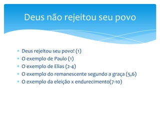 O capítulo discute como Deus não rejeitou seu povo Israel e tem um plano para salvá-los, apesar de sua desobediência atual. Ele usa exemplos de Paulo, Elias e de uma pequena parte fiel de Israel para mostrar que Deus sempre preservou um remanescente. A salvação dos gentios trará ciúmes a Israel e eventualmente toda Israel será salvo, como parte do plano irrevogável de Deus. O capítulo termina louvando a Deus por Sua sabedoria profunda e soberania sobre todas as coisas.