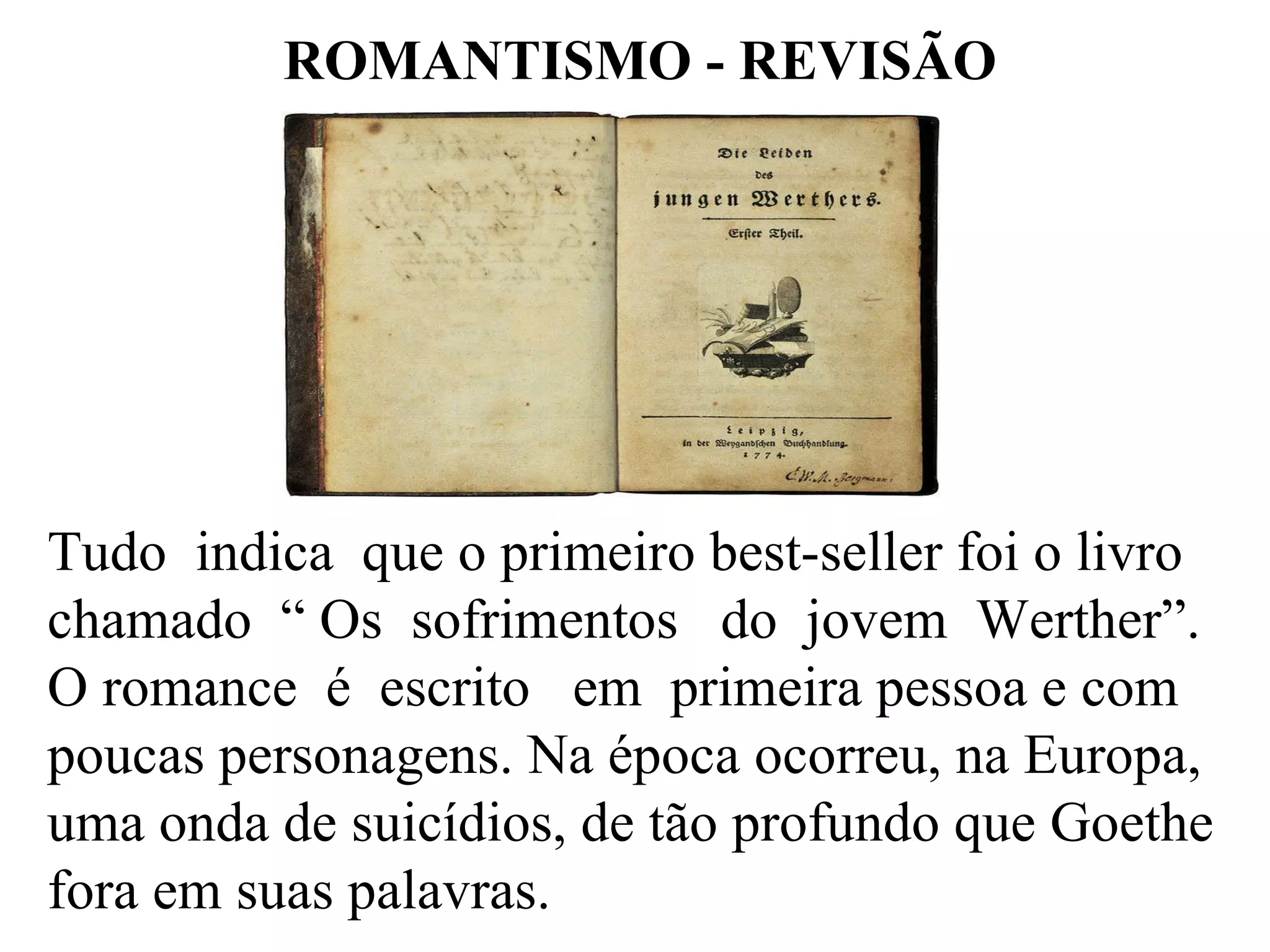 O documento aborda o Romantismo, destacando sua origem com obras como 'Os Sofrimentos do Jovem Werther' e seu impacto na Europa durante a Revolução Industrial e Francesa. Exemplos de autores como Almeida Garrett, Alexandre Herculano e Castro Alves ilustram a evolução do Romantismo em Portugal e no Brasil, refletindo temas de nacionalismo, subjetivismo e crítica social. Conclui que o Romantismo foi uma resposta às normas literárias da época, promovendo liberdade de expressão.