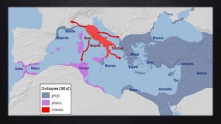 2) Roma começou como uma monarquia e depois estabeleceu uma república governada por senadores patrícios. Expandido seu território através de conquistas militares.