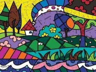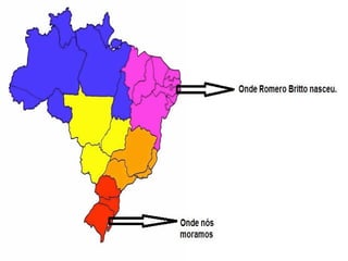 O documento apresenta o pintor brasileiro Romero Britto, nascido em Recife em 1963, que começou a pintar aos 18 anos e se tornou famoso por seus desenhos coloridos e alegres, transmitindo muita cor e alegria.