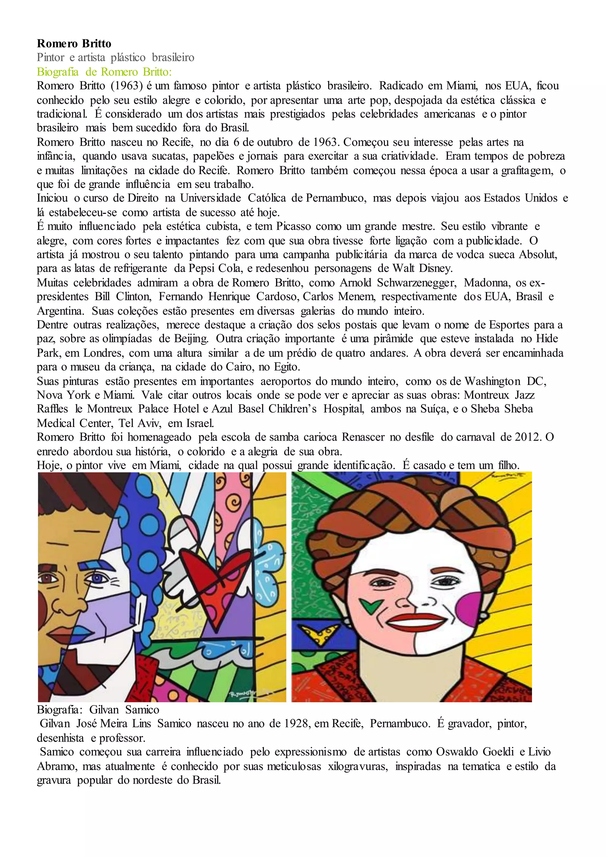 Romero Britto é um famoso pintor e artista plástico brasileiro radicado em Miami. Seu estilo colorido e alegre de arte pop o tornou um dos artistas brasileiros mais bem-sucedidos fora do Brasil. Gilvan Samico é um gravador, pintor e professor pernambucano conhecido por suas xilogravuras inspiradas na cultura popular nordestina. Ambos os artistas são considerados importantes na cena artística brasileira.