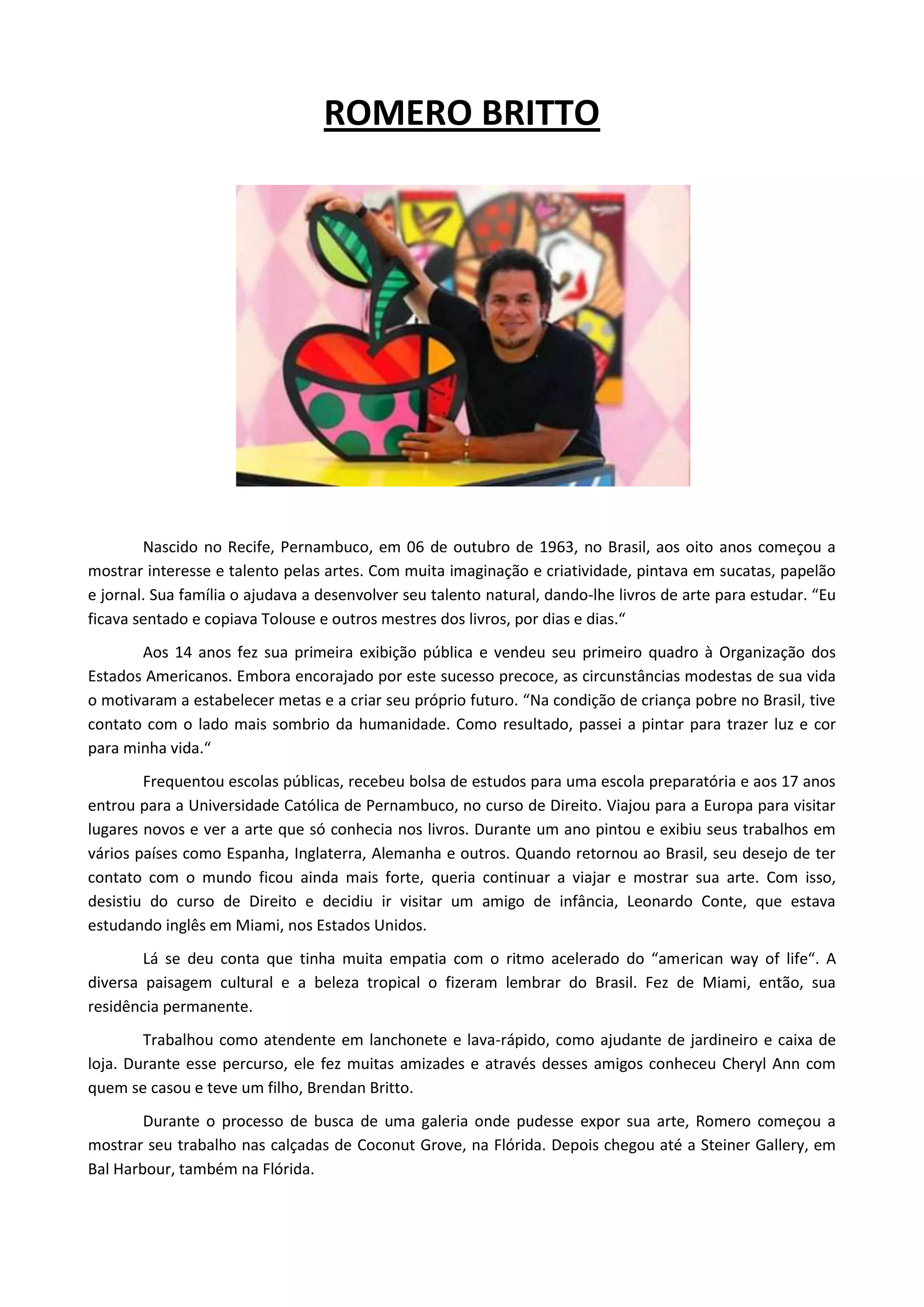 Romero Britto é um artista plástico brasileiro nascido no Recife que se mudou para os Estados Unidos. Ele começou a mostrar talento para arte desde criança e se tornou um sucesso internacional com suas pinturas coloridas e estilizadas. Britto usa sua arte para arrecadar fundos para causas filantrópicas.