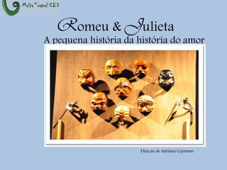 O documento descreve a peça Romeu e Julieta que será apresentada pela companhia Malta Teatral CBD. A peça usará elementos da Commedia dell'Arte e será interpretada por um casal de atores usando máscaras, com poucos objetos de cena para criar um espaço vazio. A direção é de Adriano Cypriano e a peça tem duração de 60 minutos.