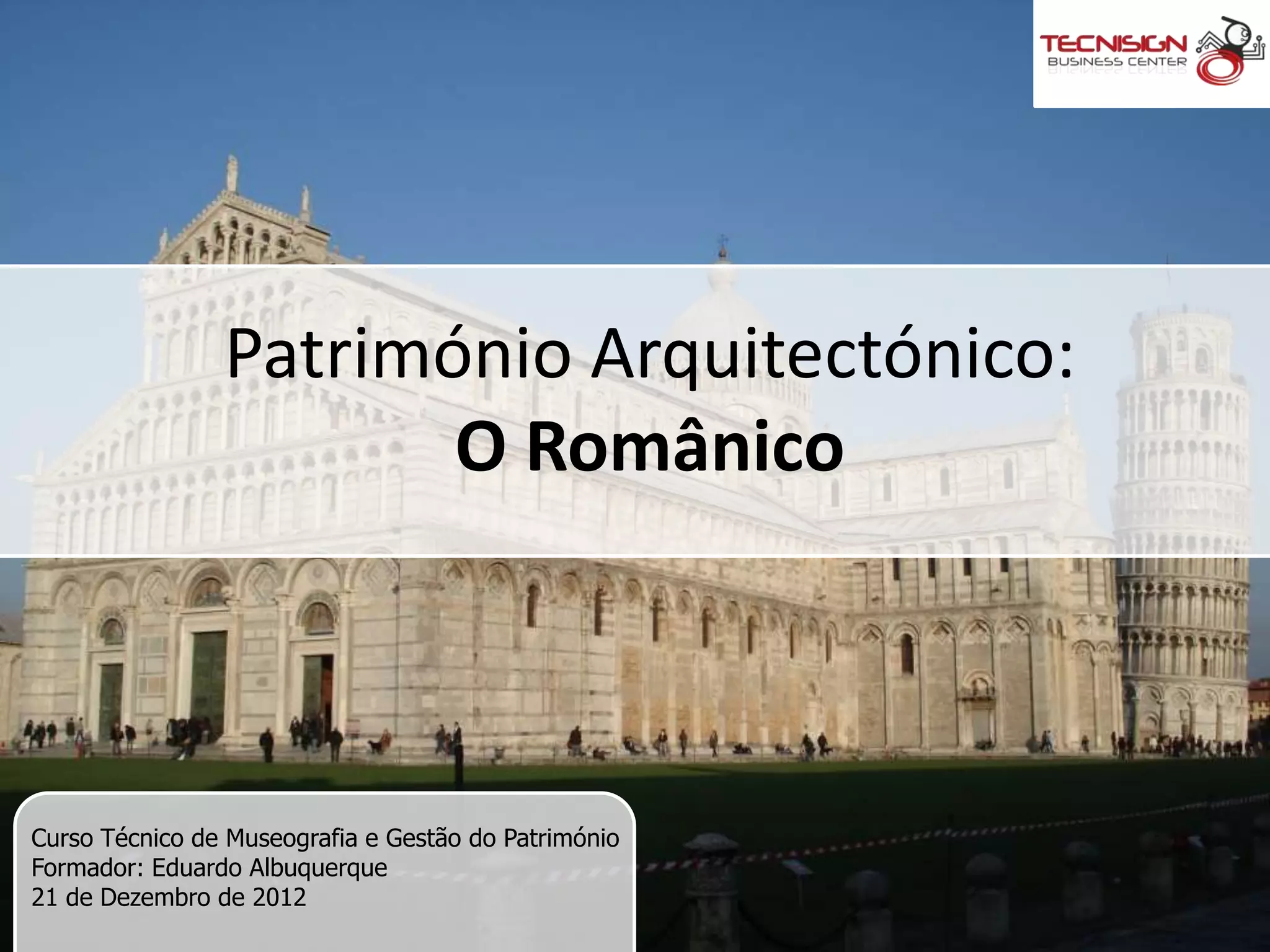 O documento discute a arquitetura românica. Ele fornece uma introdução ao estilo românico para profissionais de turismo, museografia e gestão do patrimônio, com o objetivo geral de reconhecer as características gerais do românico na arquitetura e o objetivo específico de estabelecer uma relação visual e estilística entre vários monumentos deste estilo.