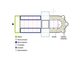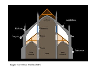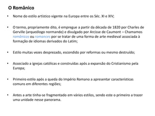 O documento descreve o estilo artístico Românico que predominou na Europa entre os séculos XI e XIV. O Românico foi o primeiro estilo pós-queda do Império Romano a apresentar características comuns entre diferentes regiões. As igrejas românicas eram robustas, com paredes espessas e contrafortes, e serviam para fortalecer a fé cristã e a Igreja Católica na época medieval.