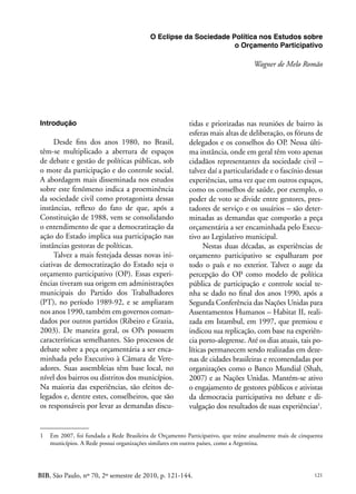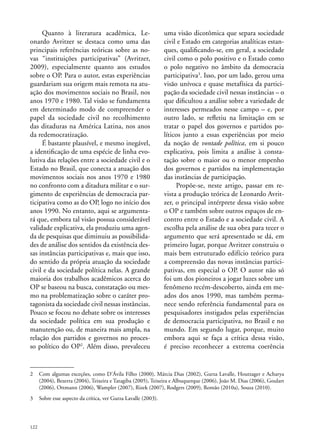 O documento discute a visão predominante nos estudos sobre Orçamento Participativo (OP) que enfatiza o protagonismo da sociedade civil nessas instâncias, diminuindo a análise dos interesses da sociedade política. O autor argumenta que a produção teórica de Leonardo Avritzer, principal intérprete dessa visão, levou a uma agenda de pesquisa limitada que produziu uma visão dicotômica entre sociedade civil e Estado. Isso dificultou compreender melhor a variedade de interesses e o papel dos governos e partidos no