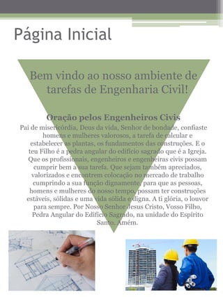 O documento apresenta uma oração dedicada aos engenheiros civis, pedindo a Deus que estes profissionais possam cumprir bem suas tarefas e encontrem colocação no mercado de trabalho. Em seguida, lista várias tarefas agendadas para engenharia civil ao longo do mês de outubro e início de novembro.