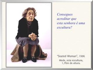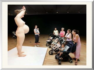 Ron Mueck é um escultor hiper-realista australiano nascido em 1958. Ele é conhecido por criar esculturas em tamanho real ou maior que a vida de figuras humanas com um alto grau de detalhe e realismo. Sua obra mais famosa é "Pregnant Woman" de 1997, medindo 2,52m de altura.