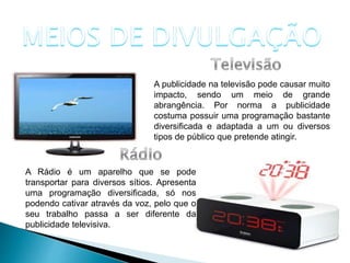 O documento discute os diferentes meios de comunicação de massa e sua evolução ao longo do século XX, com foco na publicidade em cada meio. Apresenta exemplos de campanhas publicitárias bem-sucedidas em Portugal e os riscos do hábito de fumar para a saúde.