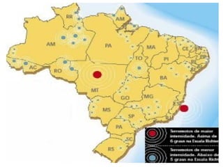 O documento descreve os principais tipos de placas tectônicas e terremotos ocorridos no Brasil, incluindo os maiores terremotos registrados em São Paulo, Espírito Santo e Mato Grosso nas décadas de 1920-1980. Também discute o terremoto de 2008 no litoral paulista que foi sentido em vários estados.