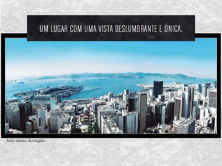 O documento descreve o empreendimento comercial Rosário 1 Office Center, localizado em uma área estratégica da cidade. O prédio de 16 andares possui lojas e salas comerciais lineares, além de salões multiuso e um terraço na cobertura. O empreendimento oferece infraestrutura completa e serviços como segurança 24 horas e manutenção.
