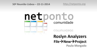 Este documento resume a 50a reunião presencial da Netponto em Lisboa no dia 22 de novembro de 2014. O tópico principal da reunião será sobre Roslyn Analyzers apresentado por Paulo Morgado. O documento também fornece detalhes sobre os próximos eventos da Netponto.