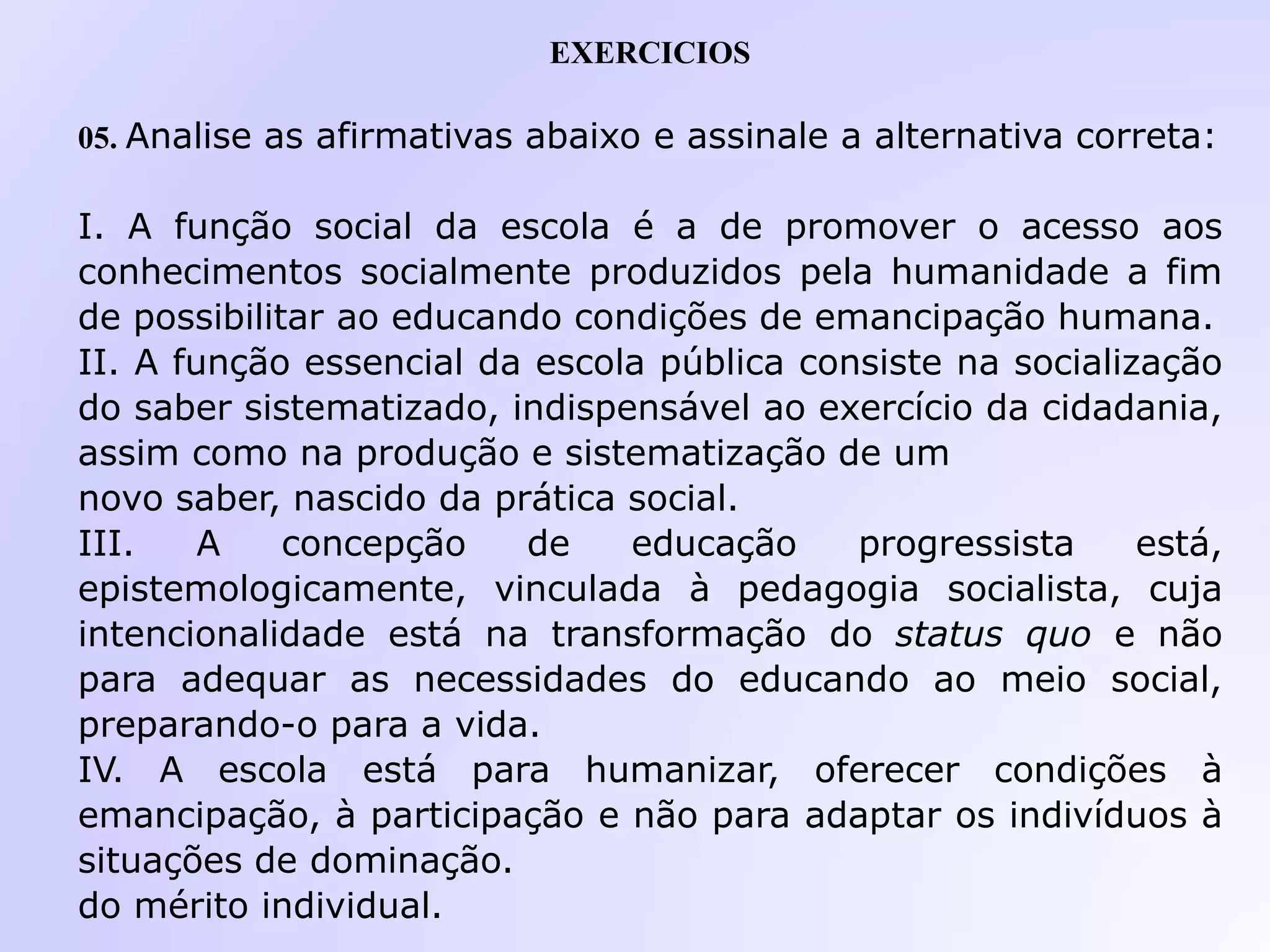 III. Por fim, define currículo como o conjunto de atividades e matérias ministradas na escol