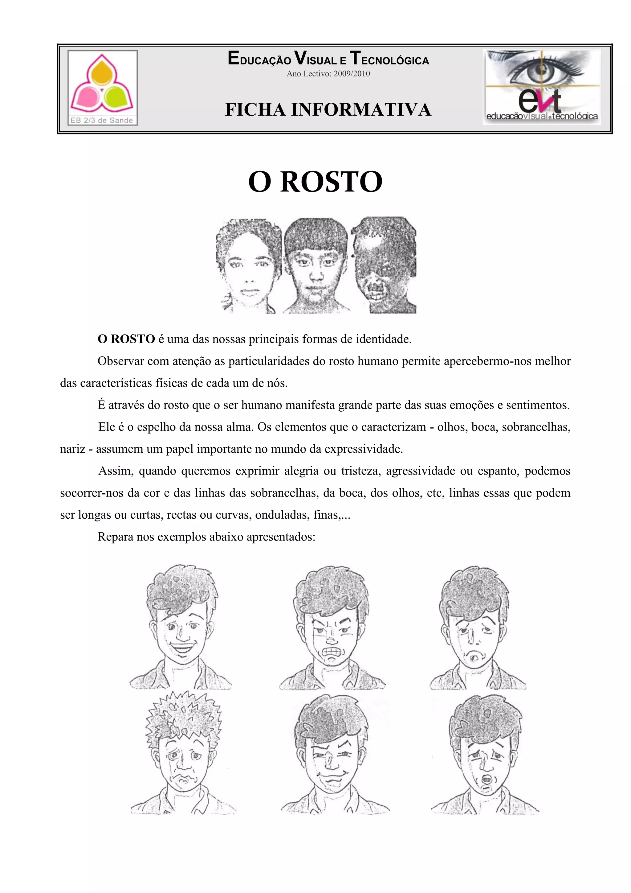 Este documento discute a importância do rosto humano na identidade e expressão. O rosto é o espelho da alma e usa elementos como olhos, boca e sobrancelhas para expressar emoções. Artistas historicamente usaram um cânone para representar proporções ideais do rosto, dividindo-o em seções para facilitar retratos realistas.