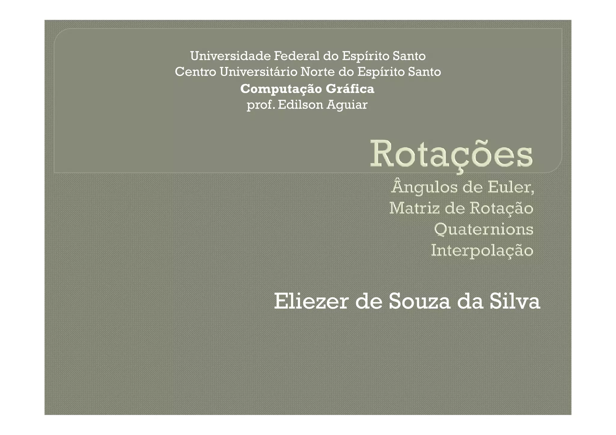 O documento discute a representação e interpolação de rotações em computação gráfica, destacando o uso de quaternions e a fórmula de Rodrigues como soluções para problemas de ambiguidade encontrados com ângulos de Euler. Ele aborda a eficácia das coordenadas homogêneas para representar transformações afins e os desafios da interpolação entre eixos de rotação. Vantagens e desvantagens de diferentes métodos, como gimball-lock e a interpolação esférica, também são discutidas, fornecendo uma visão abrangente das técnicas de animação em 3D.