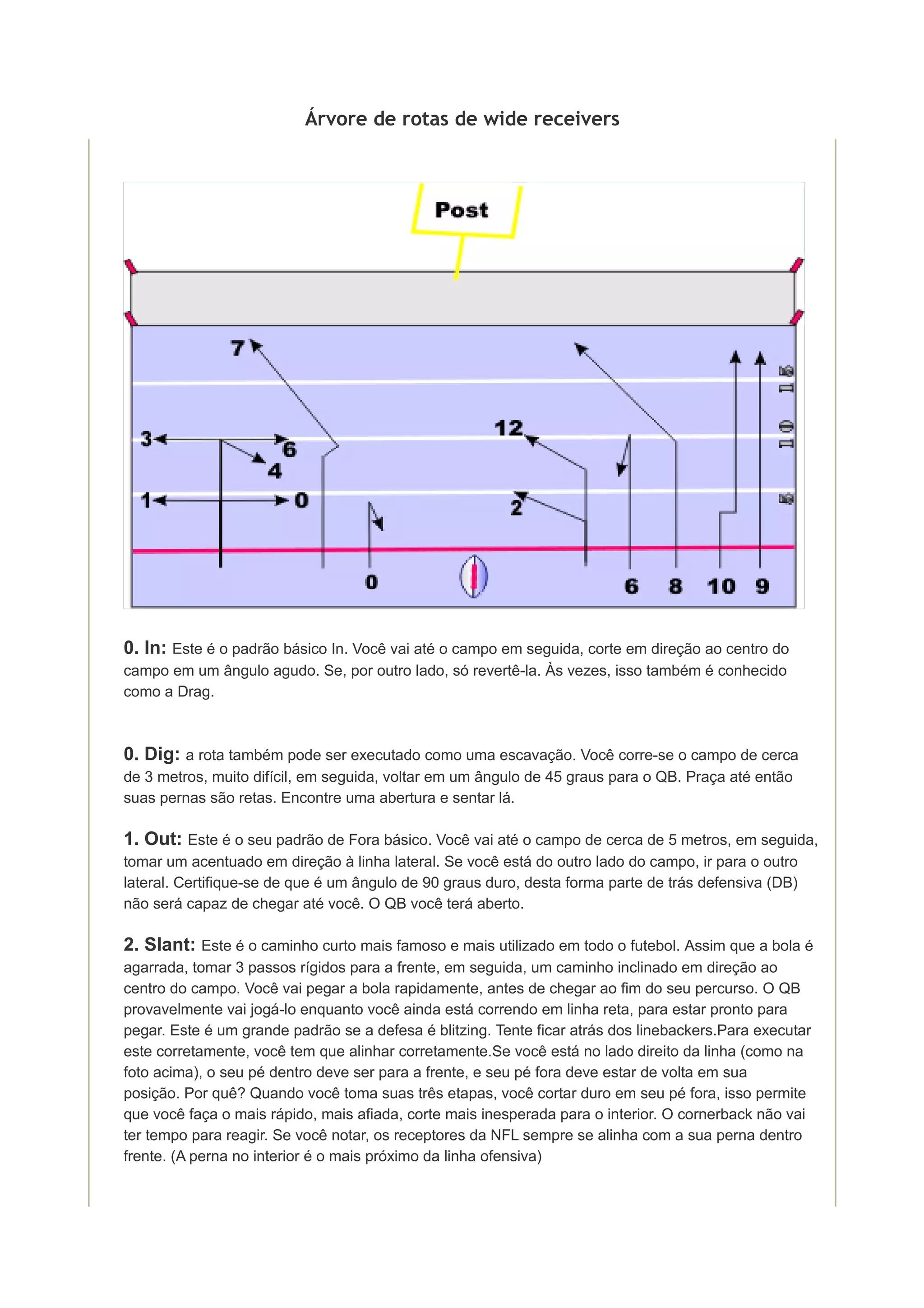 1. A árvore de rotas descreve vários padrões de rota para wide receivers, incluindo rotas curtas como In, Slant e Out; rotas médias como Dig e Deep Out; e rotas longas como Deep In, Post e Go.
