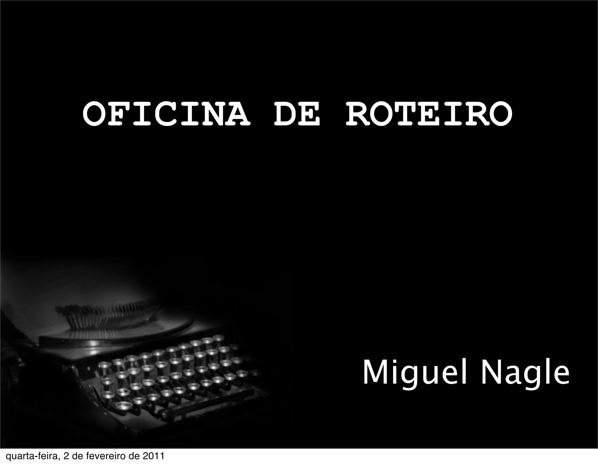 O documento apresenta uma oficina sobre roteiro, definindo o que é um roteiro através de várias citações e explicando seu propósito. A oficina também discute tópicos como encontrar ideias, criar personagens, narrativa, diálogos e outras técnicas para desenvolver um roteiro.