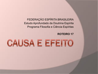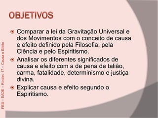 1) O documento compara a lei da gravitação universal e dos movimentos com o conceito de causa e efeito segundo a filosofia, ciência e espiritismo, analisando diferentes significados como pena de talião, carma, fatalidade e justiça divina.