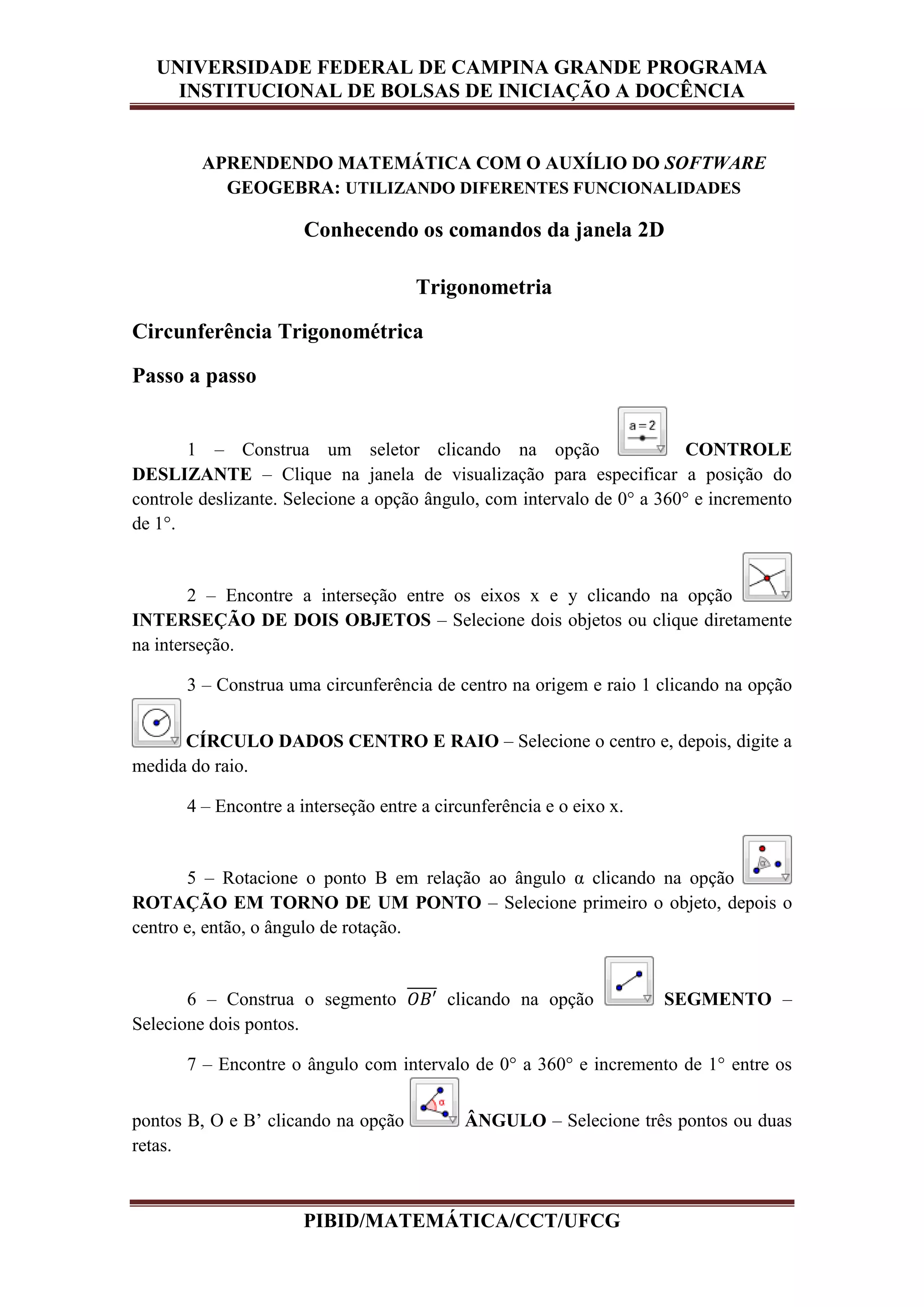 Este documento descreve como utilizar diferentes ferramentas do software Geogebra para ensinar conceitos matemáticos como trigonometria e vetores. Ele fornece 30 passos detalhados para construir gráficos geométricos usando comandos como círculo, segmento, ângulo, vetor e reta para ilustrar relações trigonométricas e propriedades de vetores.