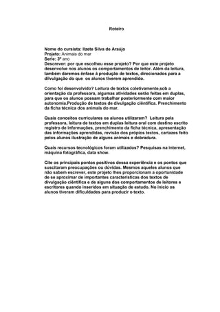 Este projeto sobre animais do mar ensinou estudantes do 3o ano sobre leitura e produção de textos. A professora Ilzete Silva de Araújo desenvolveu o projeto através de leituras em grupo e em duplas, preenchimento de fichas técnicas, e produção de cartazes e textos de divulgação científica sobre os animais. O projeto utilizou recursos como pesquisa na internet, fotografia e apresentações para envolver os alunos, mesmo aqueles com dificuldades de escrita.