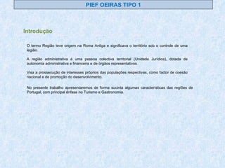 Este documento fornece informações sobre as diferentes regiões de Portugal, descrevendo suas características, pontos turísticos e pratos típicos. Apresenta breves descrições da geografia, história, cultura e economia de cada uma das regiões portuguesas.