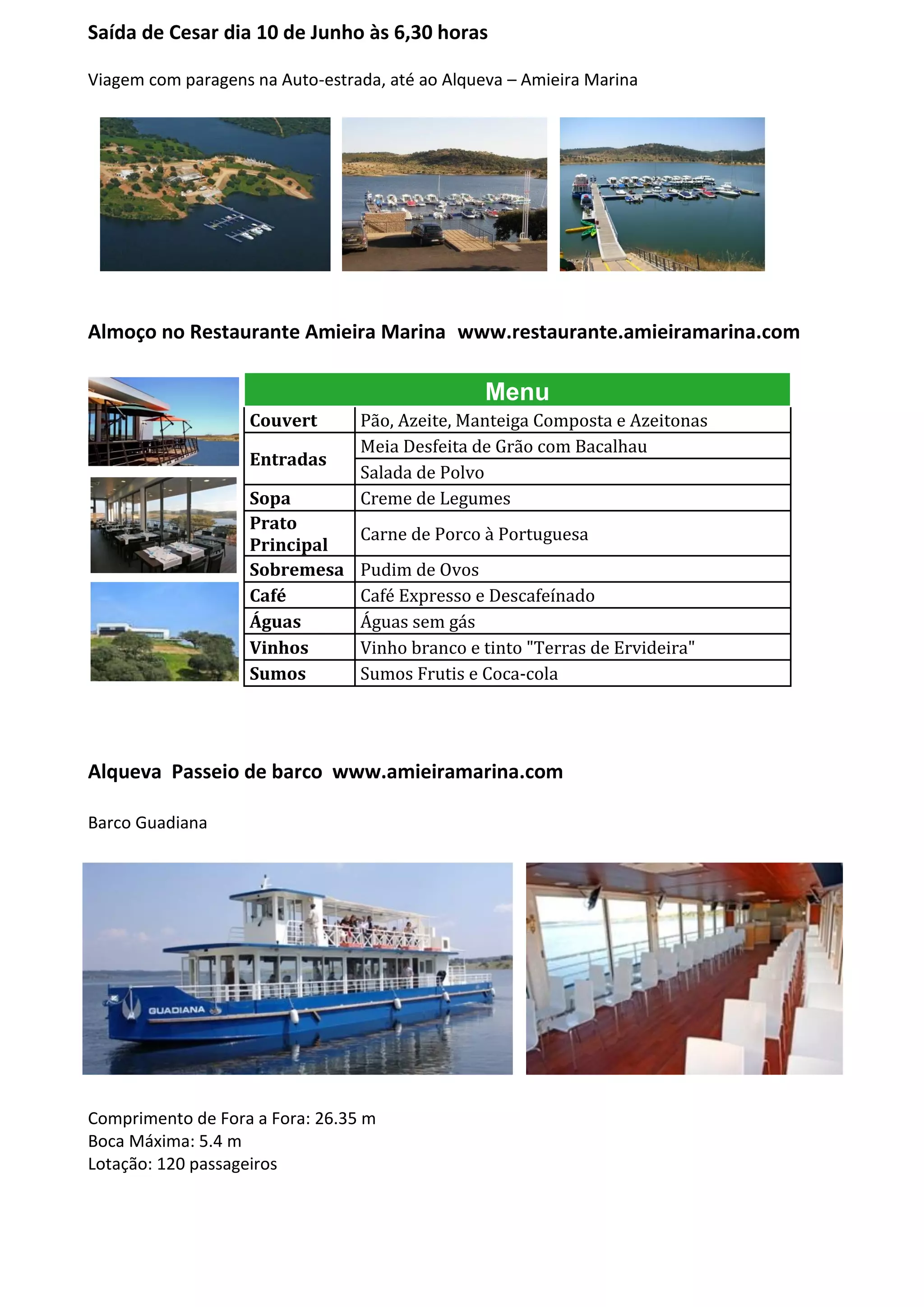 1) Saída de Cesar em 10 de Junho para uma viagem pela Estrada do Alqueva, incluindo almoço em Amieira Marina e passeio de barco no Alqueva.