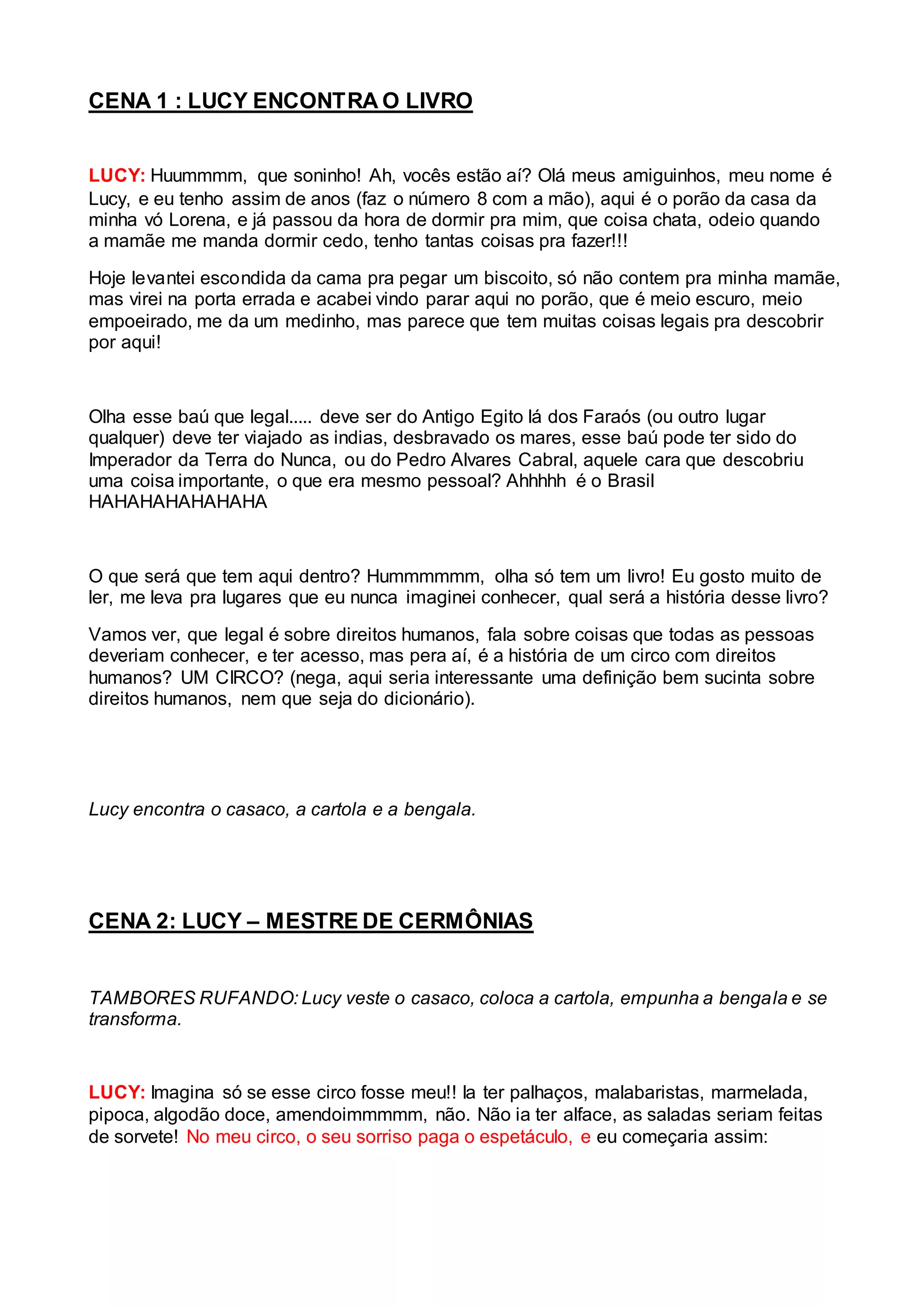 Lucy, uma criança curiosa, descobre um livro sobre direitos humanos e sonha em criar um circo onde todos são bem-vindos e respeitados, abordando temas como aceitação e igualdade. Através de várias cenas, personagens como um malabarista em situação de vulnerabilidade e uma mulher barbada enfrentam preconceitos, mas encontram apoio e oportunidades. No final, a peça ressalta a importância de ajudar uns aos outros e valorizar as diferenças.