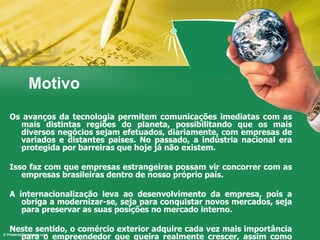 O documento discute as vantagens da exportação para empresas brasileiras, incluindo a diversificação de mercados, aumento da produtividade e qualidade do produto, e diminuição da carga tributária por meio de incentivos fiscais. Também fornece informações sobre como planejar e executar uma exportação, cobrindo pesquisa de mercado, logística, transporte e onde buscar apoio.