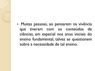 [1] O documento discute as limitações do ensino tradicional de ciências, focado na transmissão de conhecimentos do professor para o aluno. [2] É proposta uma abordagem mais prática e interessante para despertar a curiosidade das crianças, ao invés de apenas apontar problemas. [3] A justificativa para o ensino de ciências na educação básica é apresentada, relacionando-o à melhoria da qualidade de vida e não exigindo que o professor seja um cientista.
