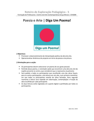 Este documento fornece instruções para uma atividade que promove a interpretação poética de obras de arte, onde os participantes escolhem um poema e uma obra de arte que o represente, e fazem leituras do poema para os outros com os olhos fechados e depois observando a obra.