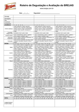 O documento fornece um roteiro detalhado para degustação e avaliação de cervejas, instruindo o degustador a observar a aparência, cheirar e analisar o aroma, provar o sabor e notar a sensação no paladar, além de fornecer uma nota geral. O roteiro inclui uma lista de atributos sensoriais a serem avaliados em cada etapa da degustação.