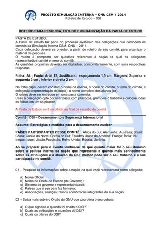 Este documento fornece um roteiro de estudo para delegados participantes de um comitê da ONU sobre desarmamento nuclear. O roteiro inclui perguntas sobre a nação representada, o órgão da ONU (DSI), o tema do desarmamento nuclear, tratados relevantes e posicionamentos nacionais sobre o assunto. As respostas devem ser digitadas em uma pasta de estudos para avaliação.