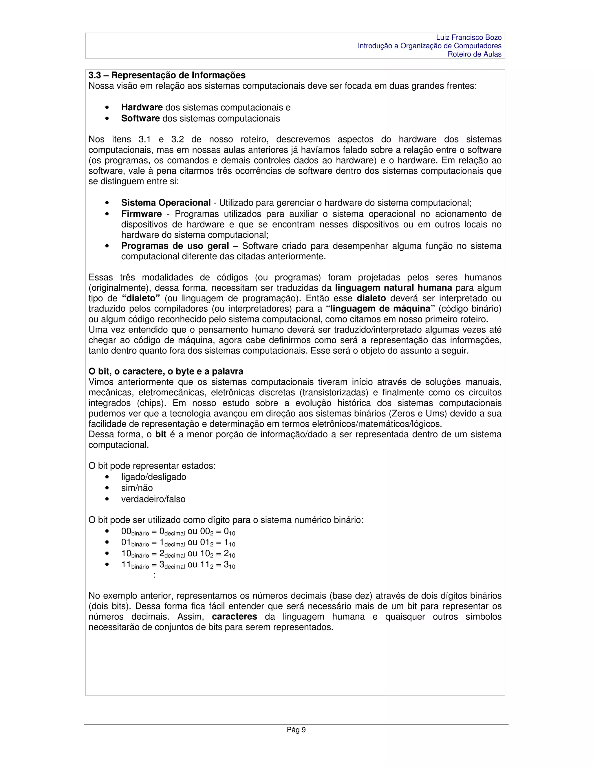 O documento discute a representação de informações em sistemas computacionais, incluindo o bit, byte, caracteres, códigos (como ASCII e BCD) e unidades maiores como kilobyte e gigabyte. Também explica os três tipos principais de software - sistema operacional, firmware e programas de uso geral - e como o pensamento humano precisa ser traduzido para a linguagem da máquina.