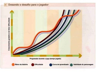 O documento discute os elementos fundamentais de design de jogos, incluindo a revisão de conceitos como personagens, motivação, e objetivos. Aborda também a interação entre narrativa e jogabilidade, além de diferentes estruturas de jogo e desenvolvimento de personagens. Há uma ênfase em evitar clichês e estereótipos, promovendo a complexidade e a profundidade nas narrativas.